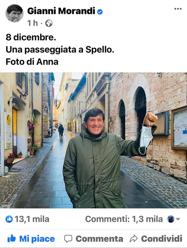 Atteso ad Assisi per l’accensione dell’albero di Natale, Gianni Morandi non si è fatto mancare una passeggiata a Spello, lungo i vicoli della splendidissima Colonia Julia. Ne ha dato subito comunicazione pubblicando una foto sulla sua pagina Facebook, con la mascherina in mano. Foto scattata da Anna come lui stesso riporta nel post. “8 dicembre. Una passeggiata a Spello. Foto di Anna”. La foto ovviamente è stata super condivisa e tanto commentato dai suoi fan.