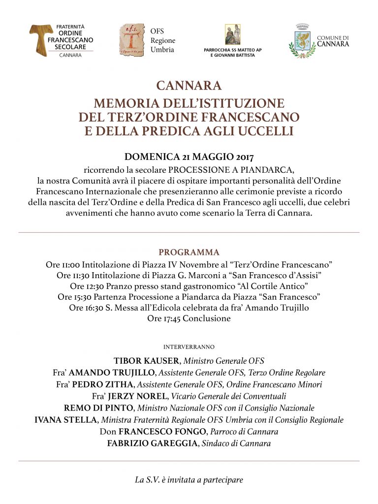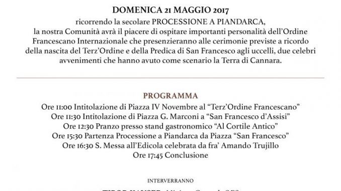Domenica 21 maggio sarà una giornata di rilievo internazionale per la piccola comunità cannarese, interamente dedicata ai due celebri eventi che la storia le ha regalato e legati alla figura di Francesco d’Assisi: l’Istituzione del Terz’Ordine Francescano e la Predica agli Uccelli. Quest’anno, infatti, le cerimonie previste a ricordo dei due famosi avvenimenti che hanno avuto come scenario la terra di Cannara, saranno presenziate da importanti esponenti dell’Ordine Francescano Internazionale.