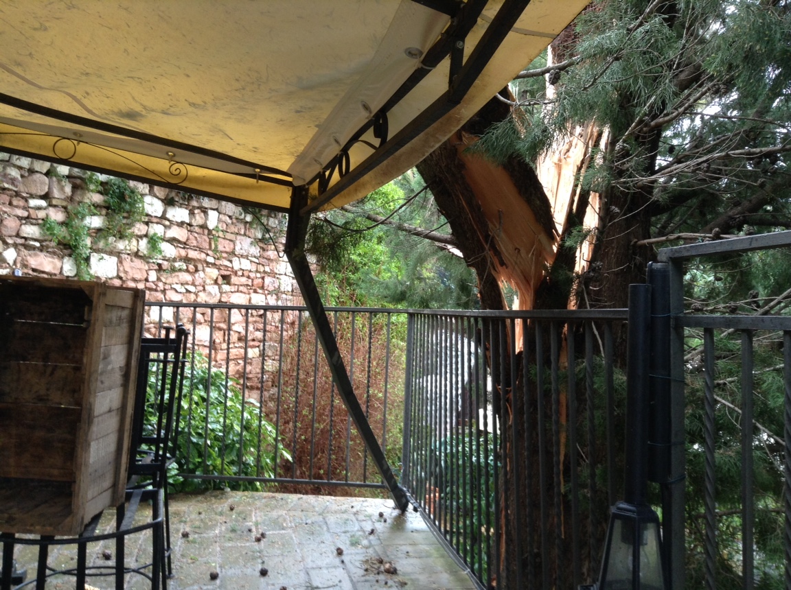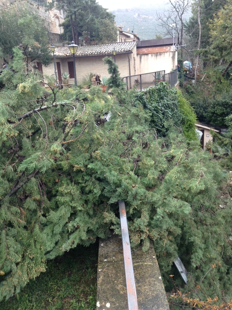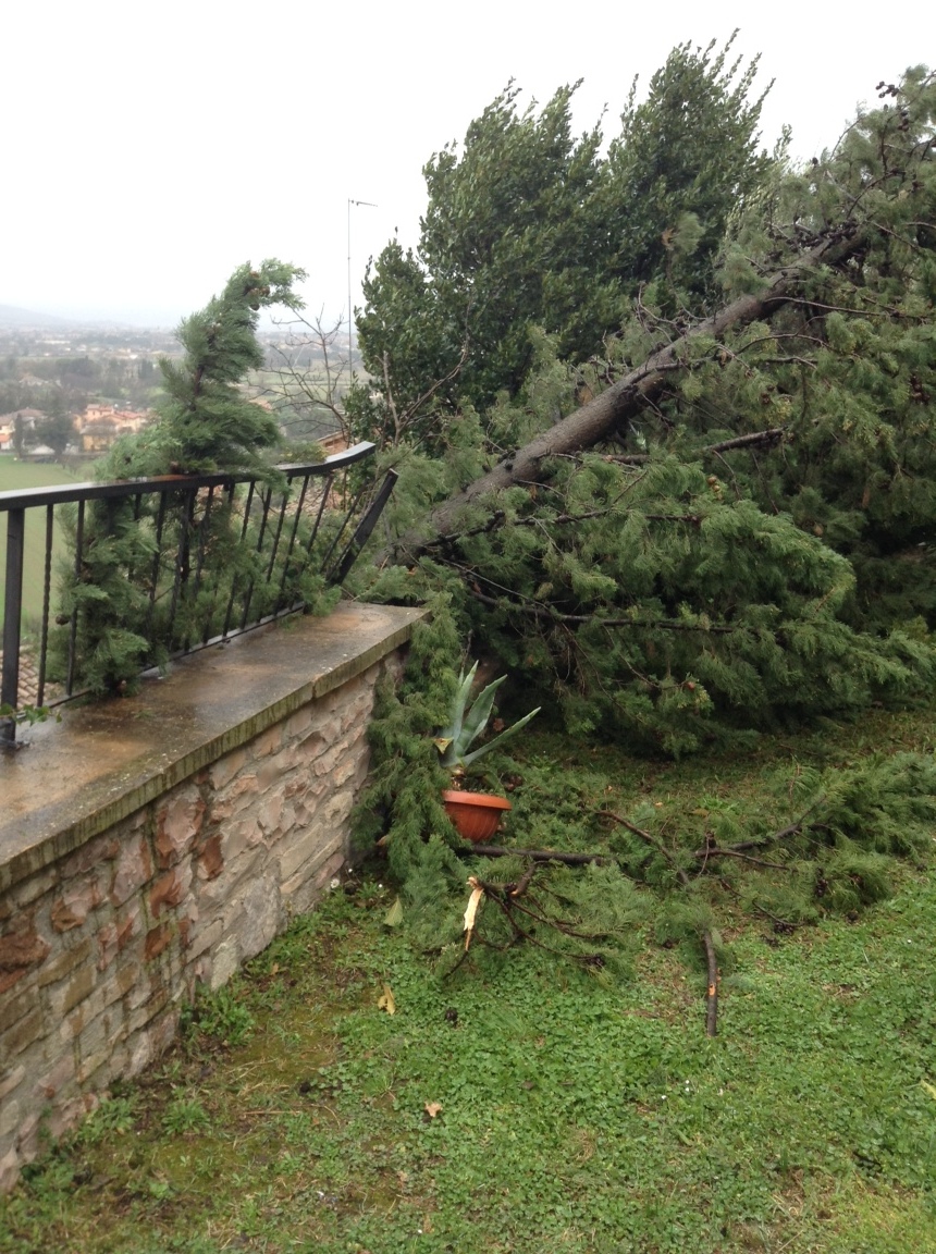 Il maltempo e il forte vento delle ultime ore sta imperversando su tutta l’Umbria. Danni ovunque. Il bilancio parla di diverse piante schiantate in strada, sulle auto e su case. Cadono pini marittimi e cipressi. A proposito di questi ultimi, uno si è schiantato anche su una abitazione privata a Spello. E’ successo alle ore 5,30 del 6 marzo 2015.