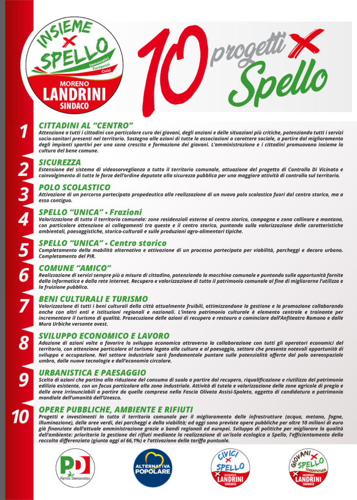 Cittadini al centro, sicurezza, polo scolastico, Spello unica con frazioni e centro storico, Comune “amico”, beni culturali e turismo, sviluppo economico e lavoro, urbanistica e paesaggio, opere pubbliche ambiente e rifiuti. Sono questi i 10 punti salienti del programma amministrativo della lista “INSIEME X SPELLO” illustrati ieri alla cittadinanza dal candidato sindaco Moreno Landrini.