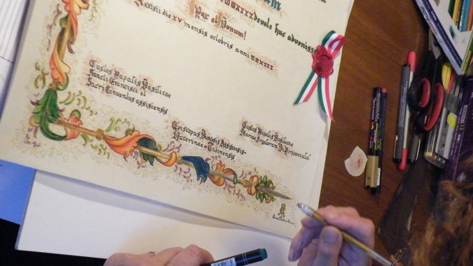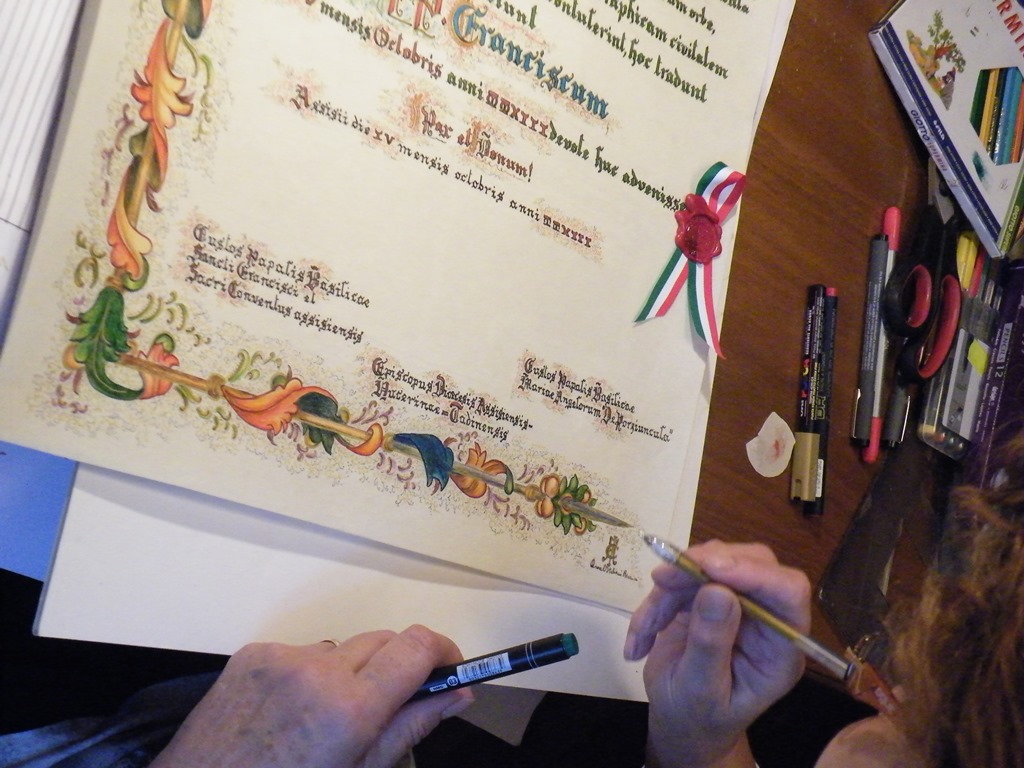 Il Testimonium dell’illustre pellegrino è stato scritto e decorato a mano dalla Signora Anna Clara Italiani Renzini, di Perugia; la pergamena è stata realizzata artigianalmente dalla “Gaita di San Pietro” in Bevagna e offerta dal Comune di Bevagna, che da anni lavora al recupero e alla valorizzazione degli antichi mestieri medievali con il celebre “Mercato delle Gaite”.