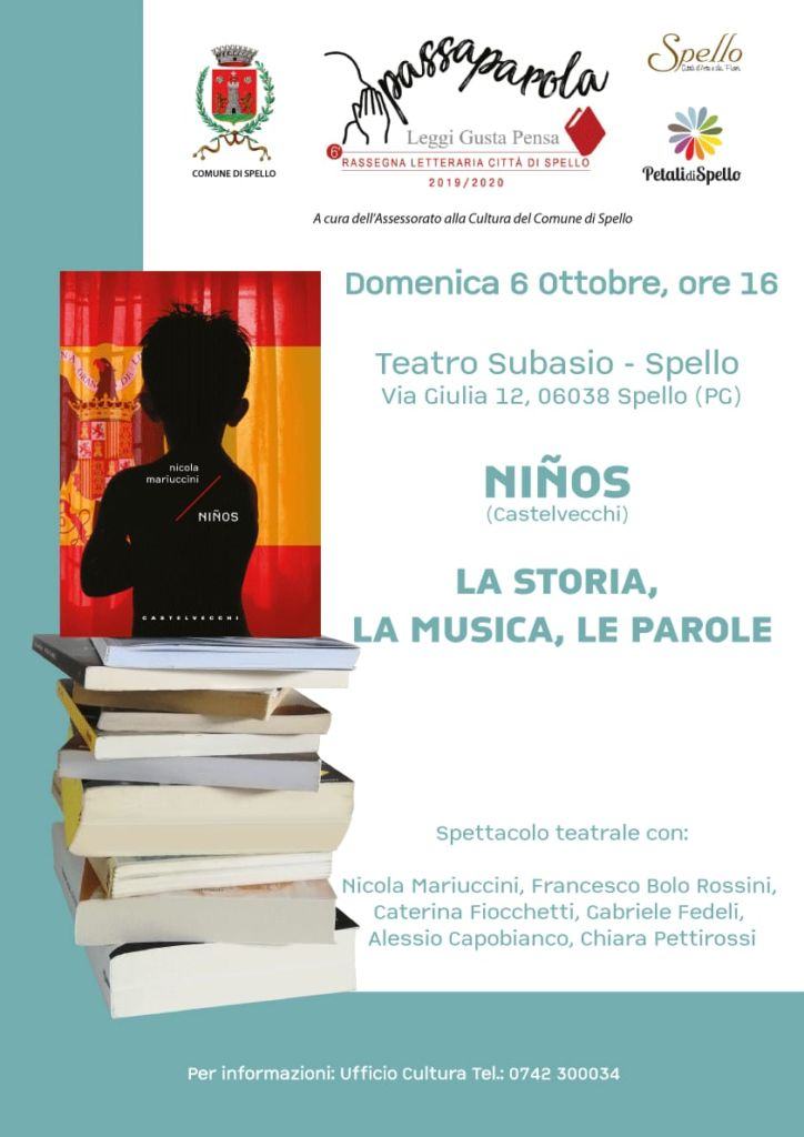L’edizione 2019/2020 si aprirà domenica 6 ottobre alle ore 16 al teatro Subasio con uno spettacolo appassionante a metà tra narrativa poetica e il teatro: Niños di Nicola Mariuccini racconta attraverso gli occhi di quattro bambini rubati e tenuti prigionieri il feroce avvento in Spagna del nazionalismo di Franco. L’orrore della storia spagnola di quegli anni viene descritto nella sua degradante quotidianità dalla voce dei piccoli protagonisti i quali, fra torture miserie e follie, continuano a sperare un mondo più luminoso. La rassegna intende inoltre lanciare un messaggio di resistenza anche alla violenza “in genere” e alla “violenza di genere”.