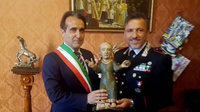 Torna a Spello il Bambino statua lignea Madonna in trono La statua lignea raffigurante il Bambino appartenente alla “Madonna in trono” torna nella disponibilità della comunità di Spello: nella giornata di ieri, il Nucleo Tutela Patrimonio Culturale (TPC) di Perugia guidato dal maggiore Guido Barbieri, in ottemperanza delle direttive da parte dell’Autorità giudiziaria, ha consegnato il bene al Comune di Spello. L’opera del XIII secolo facente parte della collezione della Pinacoteca Civica e Diocesana di Spello, dopo essere stata trafugata nel 2008 è stata ritrovata lo scorso mese di agosto all’interno della Chiesa Collegiata di Santa Maria della Reggia di Umbertide. La statua, subito affidata Nucleo al TPC di Perugia per le verifiche necessarie, ieri è stata presa in consegna dal sindaco Moreno Landrini in attesa di essere sottoposta a intervento di restauro, per essere poi consegnata definitamente alla comunità.